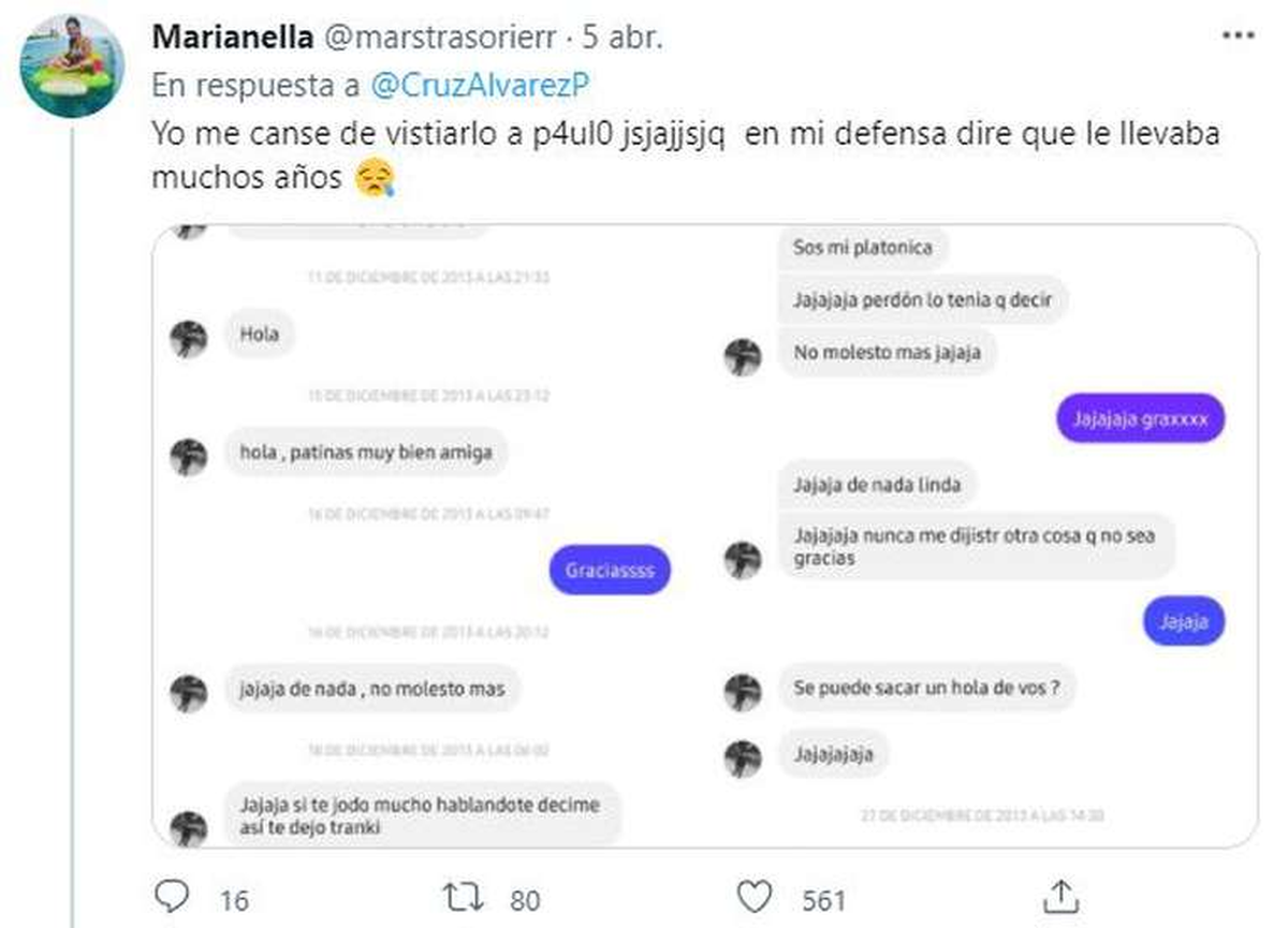 Uno de los mensajes que tuvo más interacciones fue el de @marstrasorierr, quien aseguró que se cansó de “vistearlo” a Paulo Londra. “En mi defensa diré que le llevaba muchos años”, aseguró junto a la captura de los chats.