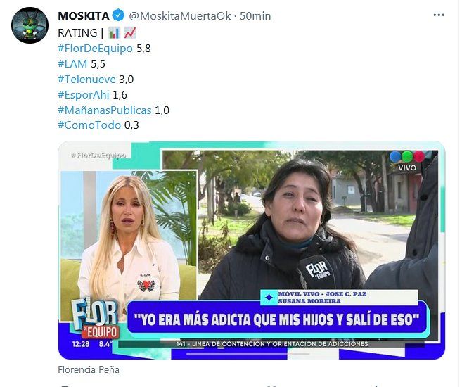 Incluso, él mismo se encargó de compartir la feliz noticia por medio de su cuenta de Twitter. Si bien ambos superaron el piso de 5 puntos, en esta oportunidad, Peña consiguió el segundo lugar con momentos de 6,1 puntos de rating. Según mostraron desde @MoskitaMuertaOk, el tercer lugar quedó en manos de Canal Nueve con un nivel de 3,3 puntos, esto de la mano de "Telenueve".