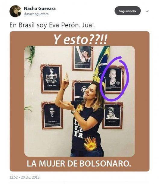 En Brasil soy Eva Perón. Jua!”, respondió Nacha en su Twitter tomándose la situación con mucho humor, mientras que varios ciudadanos brasileros le pidieron disculpas por “la ignorancia” de la mujer de Bolsonaro y por llenaron la publicación de memes demostrando incredulidad ante el error.