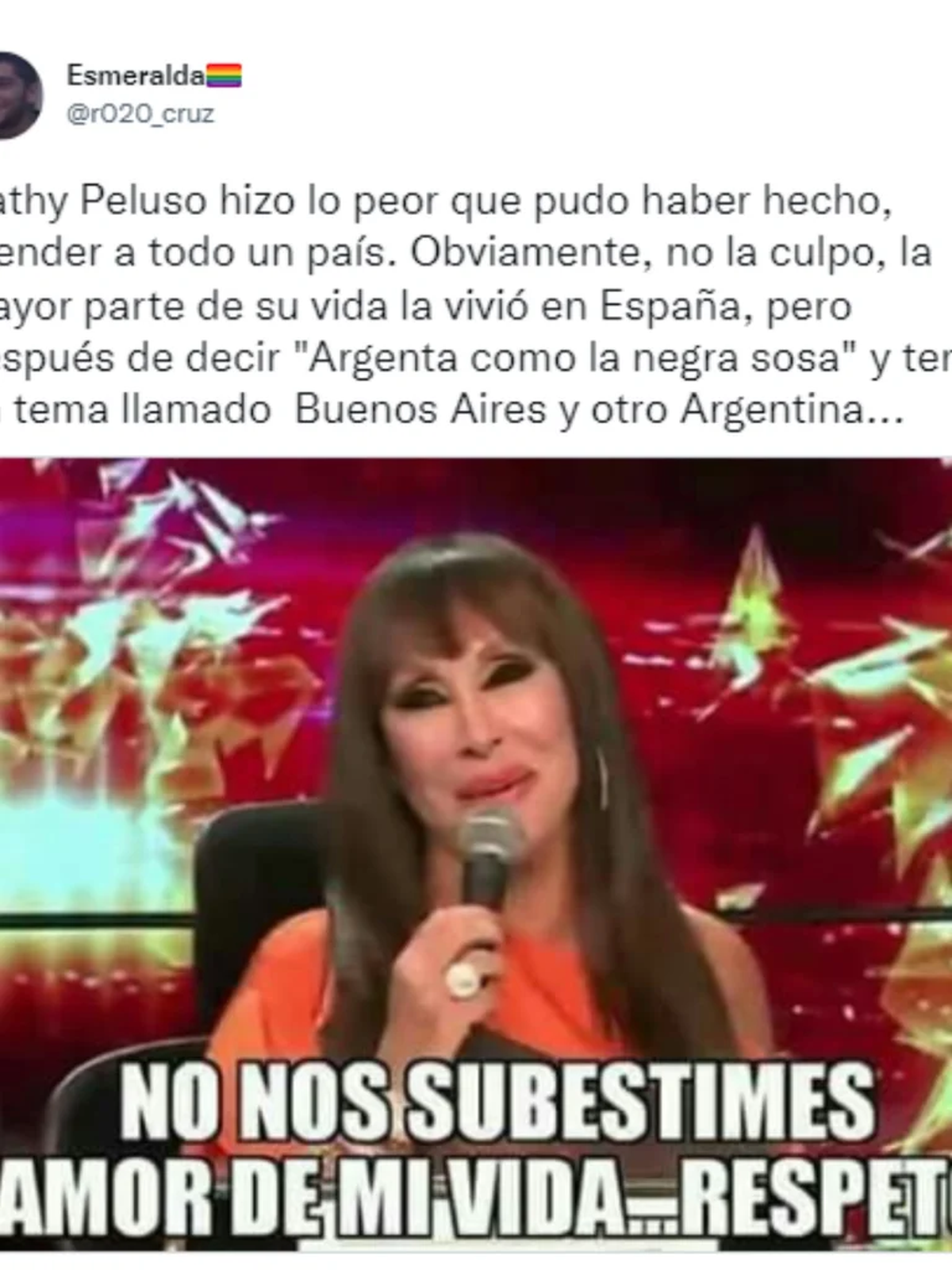 “¿Cómo vas a generar un sentido de pertenencia con un país que vino a saquear tu tierra y encima colonizó tu país?”, “Nathy Peluso hizo lo peor que pudo haber hecho, ofender a todo un país. Obviamente, no la culpo, la mayor parte de su vida la vivió en España, pero después de decir ´argenta como la Negra Sosa´ y tener un tema llamado ´Buenos Aires´ y otro ´Argentina´....”, fueron algunos de los mensajes que se pudieron leer en Twitter, muchos de los cuales apelaron a famosos memes para ponerle un poco de humor a las críticas.