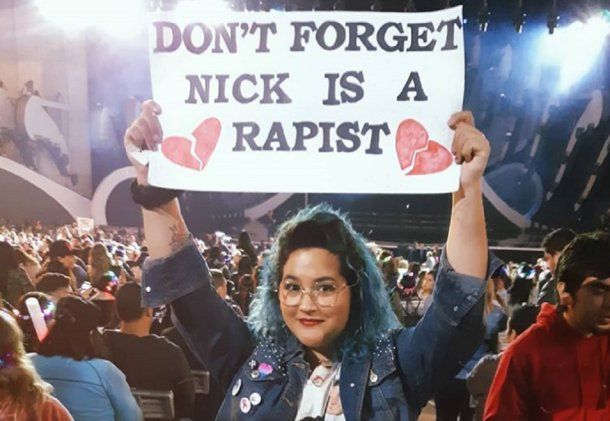En la tribuna, sin embargo, se vio un cartel poco feliz. Una de las asistentes llevó un cartel que sostuvo en lo alto: no se olviden, Nick Carter es un violador“.