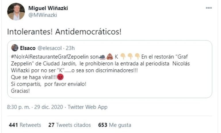 Por su parte, Miguel Wiñazki, su padre, citó un tuit y agregó: "Intolerantes! Antidemocráticos!". "#NoIrAlRestauranteGrafZepoelin son K En el restorán 'Graf Zeppelin' de Ciudad Jardín, le prohibieron la entrada al periodista Nicolás Wiñazki por no ser 'K'... o sea son discriminadores. Que se haga vira. Si compartís, por favor envialo. ¡Gracias!", versa el mensaje que compartió el hombre.