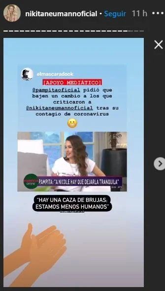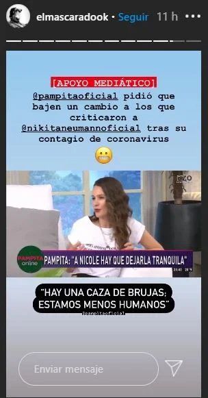 Haciendo uso de las redes sociales, elmascaradook le envió a Nicole un fragmento del descargo de Pampita a través de una historia de Instagram, ¿Y cómo reaccionó Nicole Neumann? Con agradecimiento. La modelo reposteó la publicación en su cuenta personal y le agregó el GIF de dos manitos aplaudiendo, en clara muestra de aval a los dichos de Pampita, quien desde el minuto uno que se dio a conocer la noticia de que tenía Covid-19 no dudó en bancarla.