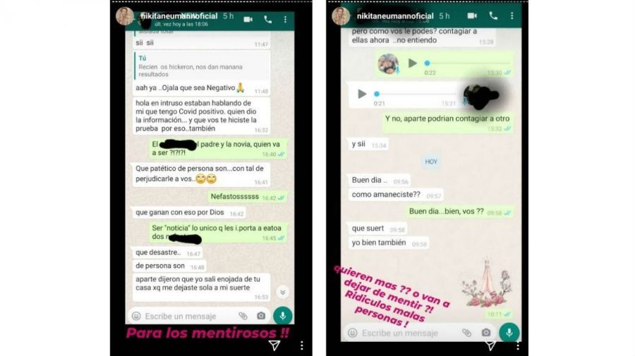 Nicole mostró con capturas que su empleada le escribió sorprendida porque esa información haya trascendido, y también le extrañó que dijeran este lunes que ella se fue de la casa de la modelo en no muy buenos términos. "Hola, en Intrusos estaban hablando de mí, que tengo Covid positivo. ¿Quién dio la información? Y que vos te hiciste la prueba por eso... también", le manifestó la mujer.