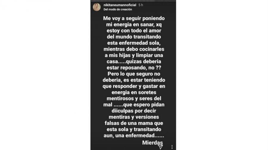 Por último, Nicole Neumann manifestó, notablemente furiosa: "Me voy a seguir poniendo mi energía en sanar, porque estoy con todo el amor del mundo transitando esta enfermedad sola, mientras debo cocinarles a mis hijas y limpia una casa. ¿Quizás debería estar reposando, no? Pero lo que seguro no debería, es estar teniendo que responder y gastar en energía en soretes mentirosos y seres del mal... que espero pidan disculpas por decir mentiras y versiones falsas de una mamá que está sola y transitando aún una enfermedad. Mierdas", cerró, sin dejar en claro si se refería a Cubero y Viciconte o a los integrantes de Intrusos.
