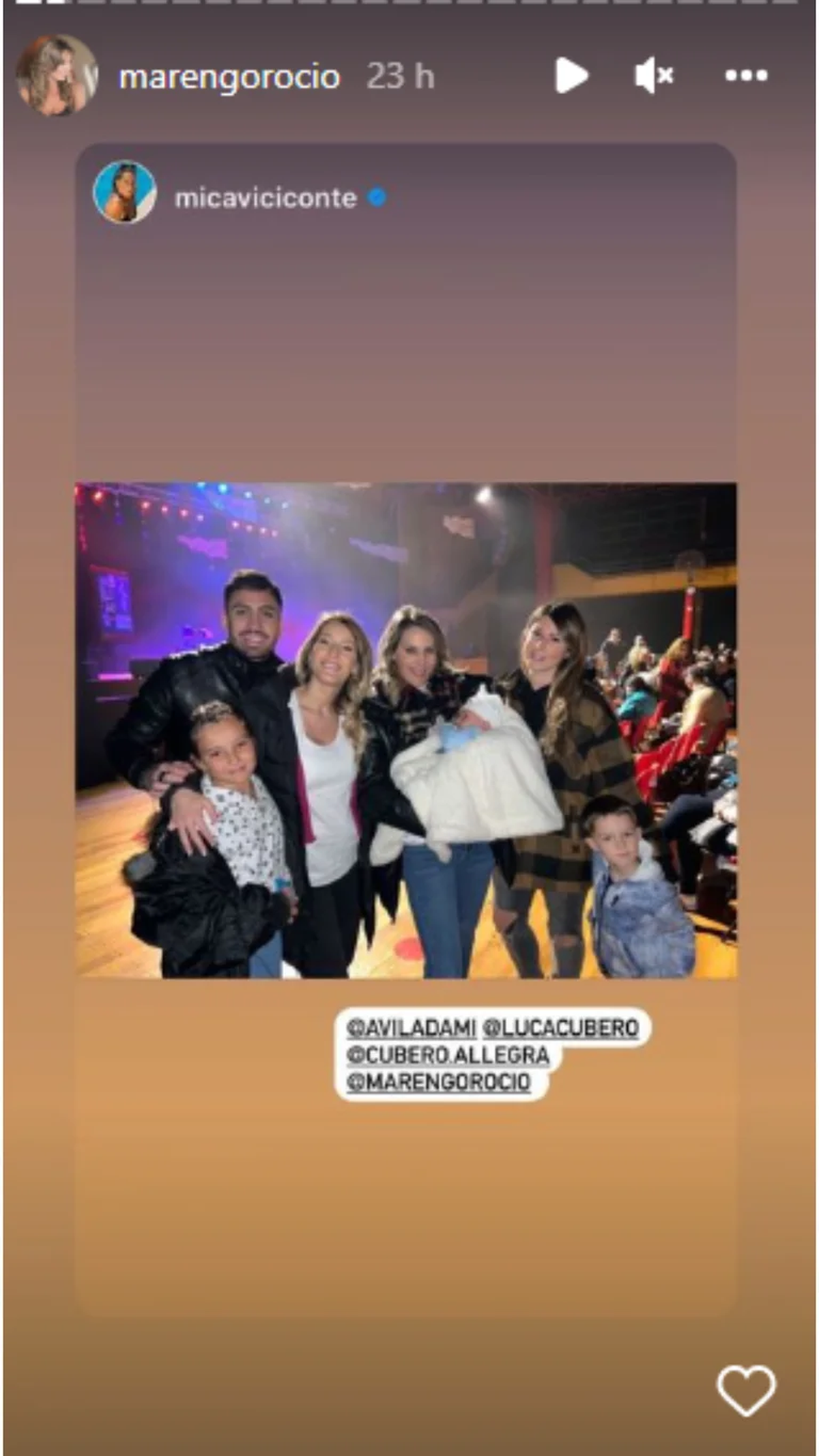 En tanto, Marengo también se encargó de apoyar a Allegra en sus redes. “Te vinimos a bancar, mirá el grupo”, se la escuchó decir mientras enfocaba a toda la “comitiva” que fue a alentarla. “¡Acá está la banda! ¡Hoy la rompés toda! ¡Te queremos, éxitos!”, escribió en sus historias la exparticipante de La Academia. Además, Rocío publicó un breve video en el que se la ve sentada en la platea junto a la ex Combate y su bebé.