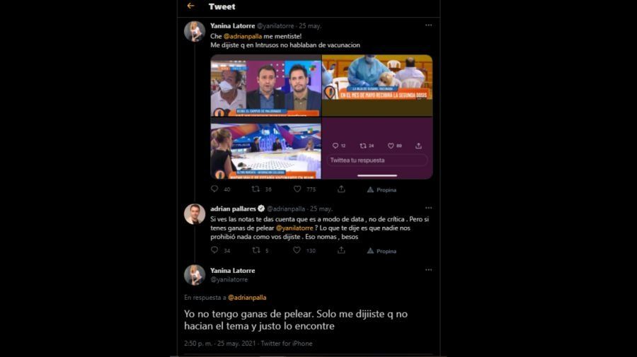 “Si ves las notas te das cuenta que es a modo de data, no de crítica . ¿Pero si tenés ganas de pelear @yanilatorre? Lo que te dije es que nadie nos prohibió nada como vos dijiste. Eso nomás, besos”, respondió Pallares en la red social del pajarito.