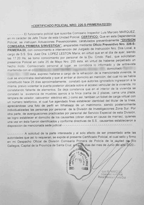 La interventora Moyano se comunicó con un integrante de la Gendarmería Nacional y el caso se derivó a la División Comisaria Primaria de la Policía de la ciudad de Río Gallegos. Se dio intervención al juzgado de Instrucción local 2, a cargo de María López Leston.