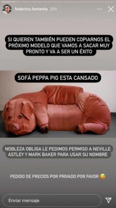 Luego, indignado agregó: "Si quieren también pueden copiarnos el próximo modelo que vamos a sacar muy pronto y va a ser un éxito: Sofá Peppa Pig está cansado. Nobleza obliga, le pedimos permiso a Neville Astley y Mark Baker para usar su nombre".