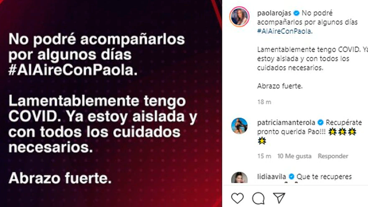 “No podré acompañarlos por algunos días #AlAireConPaola. Lamentablemente tengo COVID. Ya estoy aislada y con todos los cuidados necesarios”, escribió en sus redes sociales.