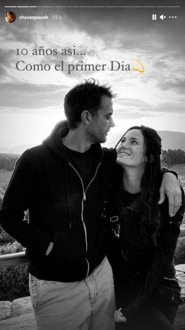 Chaves apostó por subir varias fotos de ellos a su cuenta de Instagram. “Hasta el infinito”, escribió la modelo en la primera de las imágenes. “10 años así, como el primer día”, agregó en la siguiente, en la que ambos se miran enamorados. “Con más arrugas y menos horas de sueño por día”, comentó en otra fotografía.