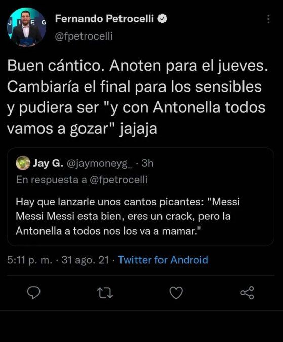En el marco del partido que va a jugar Venezuela y Argentina por las Eliminatorias, el periodista Fernando Petrocelli comentó el tuit de un usuario de esa red social que proponía “lanzarle cantos picantes” a Messi, atacando de forma misógina a su esposa.