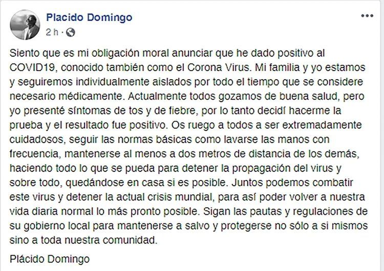 El tenor Plácido Domingo, que en las últimas semanas fue desplazado de las funciones de “Don Carlo” en Londres por las denuncias de acoso sexual, anunció haber dado positivo en sus pruebas del Covid-19 a través de su cuenta de Facebook.