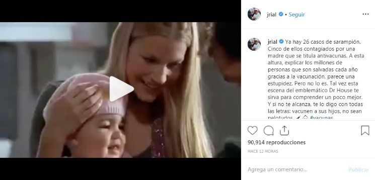Según informa diarioshow Rial utilizó el hashtag “#vacunas” y posteó un video en su cuenta de Instagram. “Ya hay 26 casos de sarampión. Cinco de ellos contagiados por una madre que se titula antivacunas. A esta altura, explicar los millones de personas que son salvadas cada año gracias a la vacunación, parece una estupidez. Pero no lo es. Tal vez esta escena del emblemático Dr House te sirva para comprender un poco mejor. Y si no te alcanza, te lo digo con todas las letras: vacunen a sus hijos, no sean pelot…”, escribió el periodista.