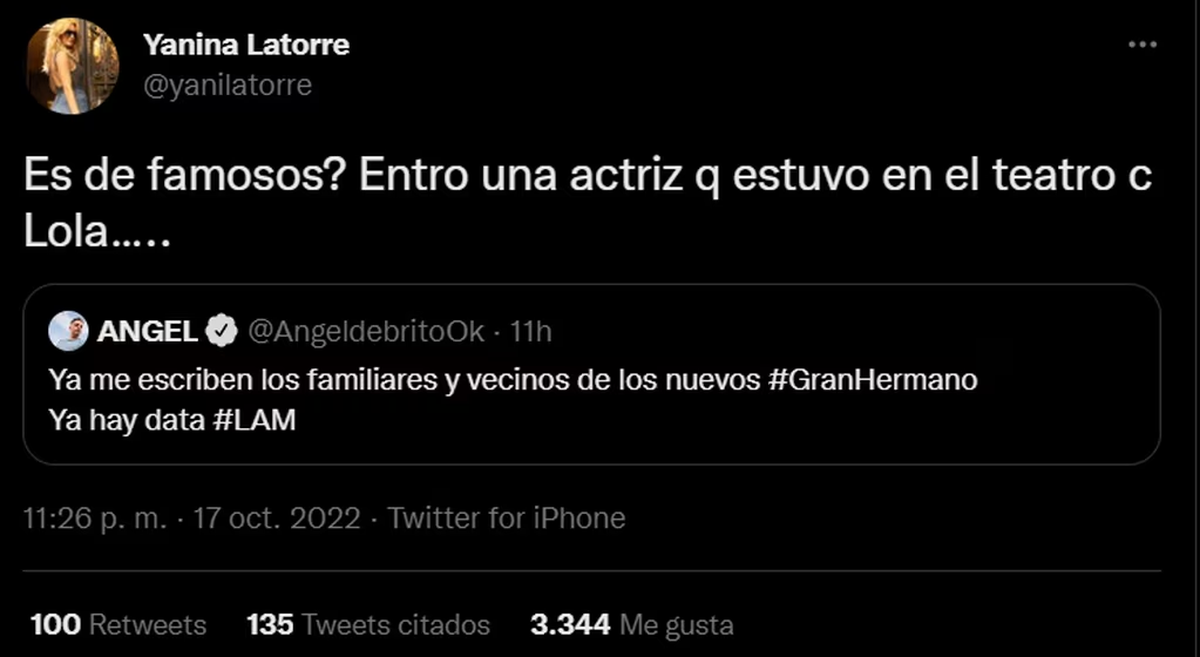 La primera polémica de Julieta llegó recién se conoció su ingreso a la casa, es que Yanina Latorre lanzó un polémico tuit con respecto a la participación de Poggio en Gran Hermano. Es que la joven actuó junto a Lola Latorre en “Amor Propio” y la panelista de LAM puso en alerta sobre que no era una desconocida y esto podía significar cierta ventaja en comparación con los otros participantes.