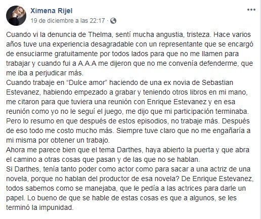 Ximena Rijel aseguró que tras “no seguir el juego” de Quique Estevanez, este le dijo que su participación en la tira terminaba: “Todos sabemos cómo se manejaba, qué le pedía a las actrices para darle un papel”, dijo.