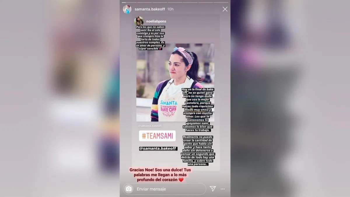 “Para los que no saben, Sami iba al colegio conmigo y es por eso que siempre hizo las tortas de todos nuestros cumpleaños. Es un amor de persona y súper sensible. Hoy en la final de ‘Bake Off’, no sé quién gana pero no tengo dudas que sos la mejor pastelera porque hacés todo riquísimo desde muy chica y siempre con mucho amor. Los que te conocemos te apoyamos Sami, sabemos lo bien que haces tu trabajo”, escribió una chica en sus redes.