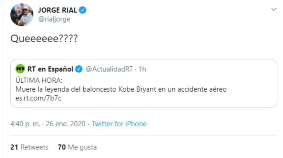 La trágica muerte de Kobe Bryant, leyenda de Los Ángeles Lakers y la NBA, a los 41 años por la caída del helicóptero en el que viajaba, generó tristeza y sorpresa en millones de personas en todo el mundo. Y así como se expresaron varias figuras del deporte mundial, Jorge Rial también se despidió del exbasquetbolista estadounidense, pero los resultados de su mensaje no fueron los esperados debido a que se volvió blanco de repudio y de duras acusaciones en contra suya y de su ego.