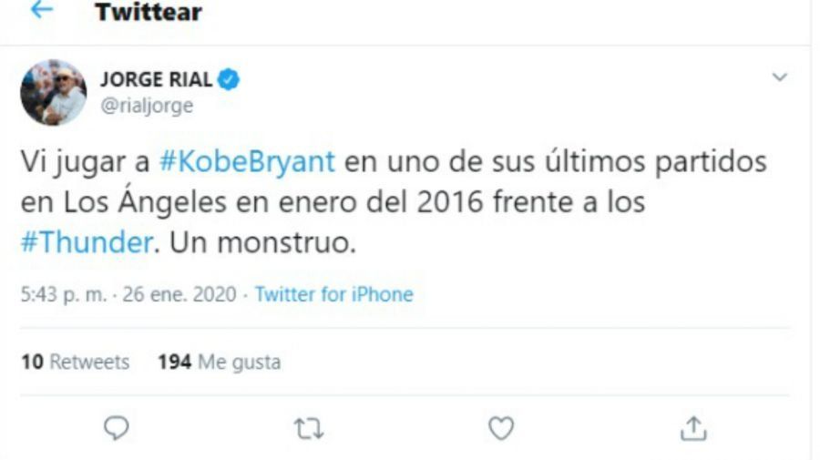 “Vi jugar a #KobeBryant en uno de sus últimos partidos en Los Ángeles en enero del 2016 frente a los #Thunder. Un monstruo”, escribió Rial, dando a conocer así que estuvo presente en la temporada final del deportista, y exactamente en el encuentro disputado entre los Lakers y Oklahoma City donde los angelinos perdieron por 117 a 113 contra la visita en el Staples Center, y en el que el difunto marcó 19 puntos, dio 6 asistencias y capturó 4 rebotes.