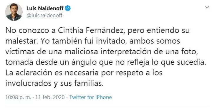 El senador Luis Naidenoff (52) afirmó en la noche de este martes que "fue víctima" junto a Cinthia Fernández (31) "de una maliciosa interpretación de una foto, tomada desde un ángulo que no refleja lo que sucedió".
