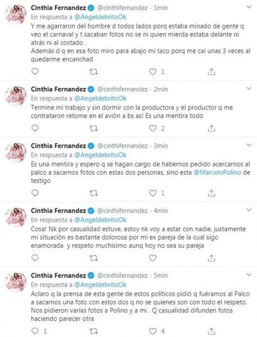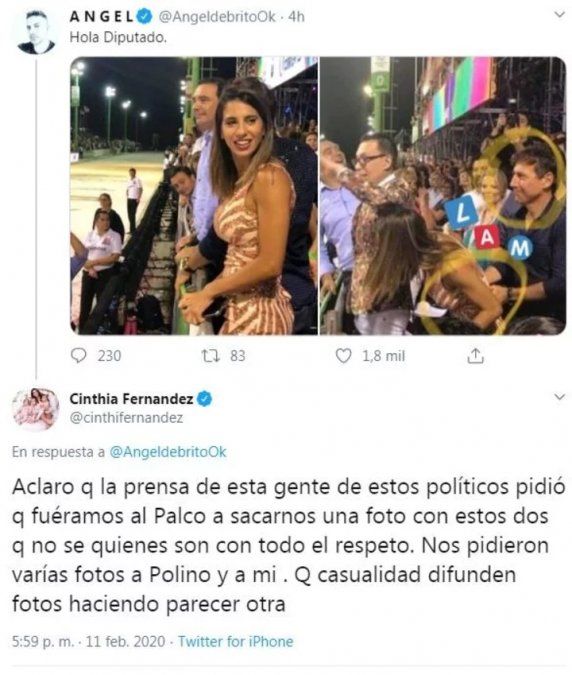 Hizo referencia así a la imagen que difundió temprano el periodista Ángel de Brito —con la sugerente frase "Hola diputado"— que sirvió para que muchos comenzaran a preguntarse si pasaba algo entre el político y la ex de Martín Baclini. La foto es del Carnaval de Corrientes.