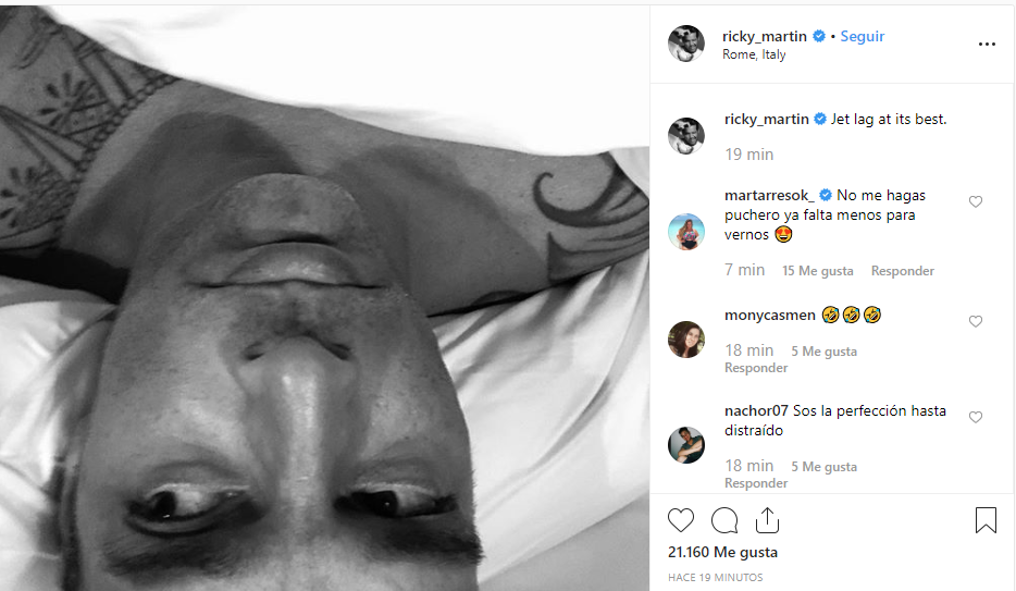 Ricky Martin volvió a las redes con una foto en primer plano de su cara. El cantante viajó a Roma, Italia para participar de un programa de televisión del país. En su cuenta de Twitter, el cantante anunció hace algunas horas que había llegado a Roma, “su hogar por las próximas 7 semanas” según escribió.
