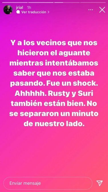 “Y a los vecinos que nos hicieron el aguante, mientras intentábamos saber qué nos estaba pasando. Fue un shock. Ah, Rusty y Suri (las mascotas) también están bien. No se separaron ni un minuto de nuestro lado”, completó Jorge.