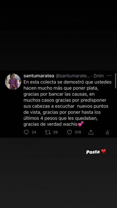 Por último a través de un posteo de Instagram agradeció el inmenso apoyo: "Lo logramos wach nos salimos con la nuestra, otra vez". Desde la página oficial de Trans Argentinxs agradecieron la ayuda de Santi Maratea: "Lo logramos, llegamos. Gracias Santi Maratea literal" a lo que el influencer respondió: "Gracias por lo que hacen y lo que van a hacer".