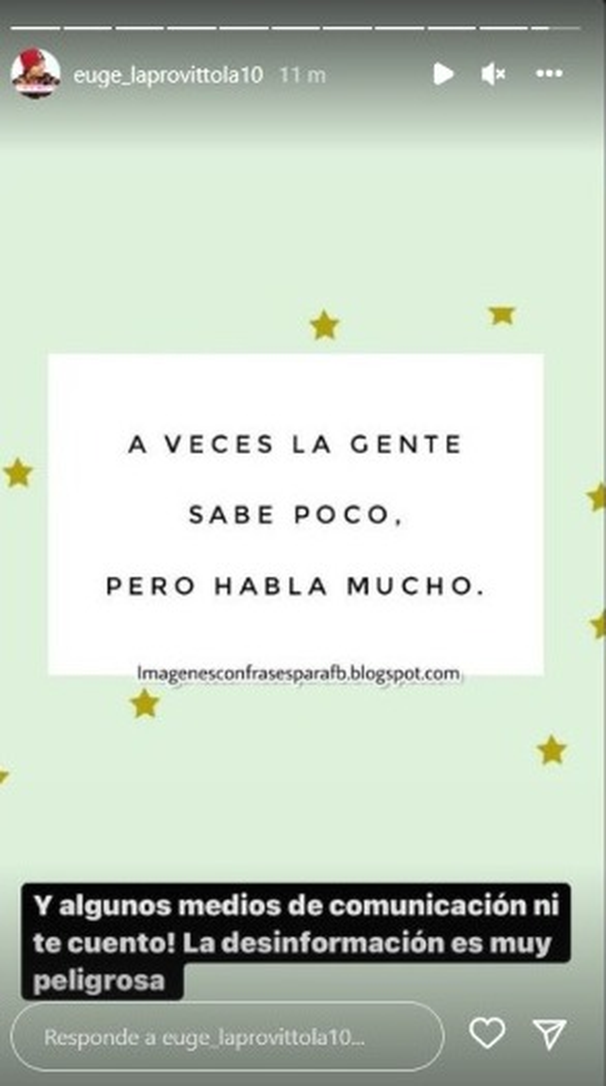 La joven compartió la siguiente frase: “A veces la gente sabe poco, pero habla mucho”. Y escribió: “Algunos medios de comunicación ni te cuento. La desinformación es muy peligrosa”.