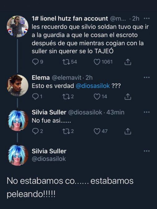 "Les recuerdo que Silvio Soldán tuvo que ir a la guardia a que le cosan el escroto después de que, mientras tenían sexo con la Suller sin querer se lo tajeó", escribió una usuaria de Twitter. Uno de sus seguidores etiquetó a Silvia, quizás esperando algún tipo de desmentida... pero el resultado fue mucho mejor.
