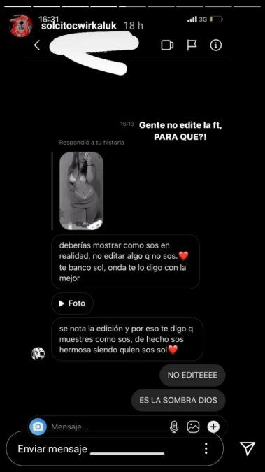Lejos de quedarse callada, la adolescente expuso el mensaje que recibió y salió a aclarar todo. "Deberías mostrar cómo sos en realidad, no editar algo que no sos. Te banco Sol, onda te lo digo con la mejor. Se nota la edición y por eso te digo que muestre cómo sos, de hecho sos hermosa siendo quién sos", expresó en el comentario su seguidora.