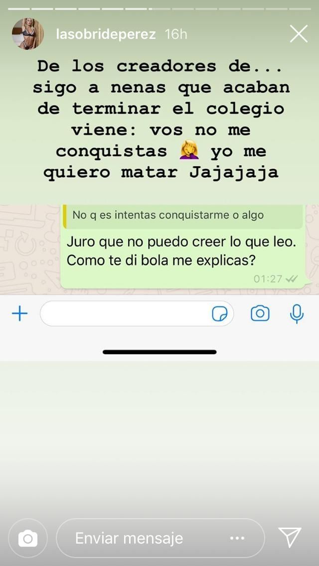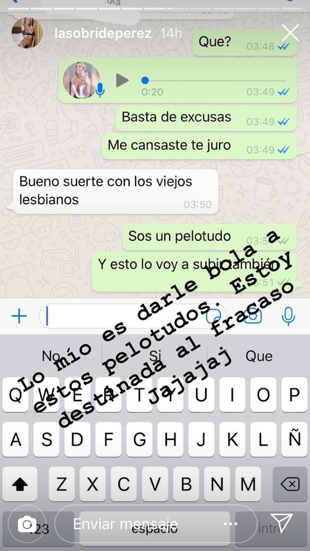 Lejos de dejar el tema ahí, la modelo publicó cómo siguió la charla. “Basta de excusas. Me cansaste, te juro“, le dejó en claro ella. Y le mandó un audio de 20 segundos. Entonces el chico le contestó: “Bueno, suerte con los viejos lesbianos“. A lo que ella sentenció: “Sos un pelot… Y esto lo voy a subir también“.