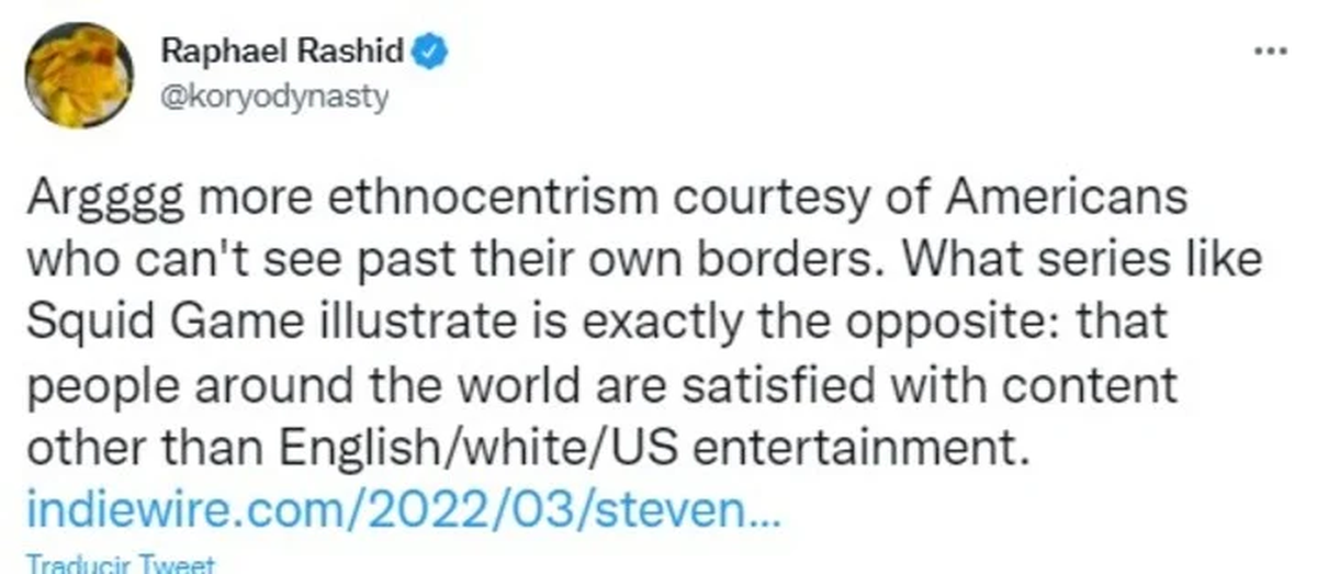 El periodista Raphael Rashid, por su parte, opinó: “Argggg más etnocentrismo cortesía de los estadounidenses que no pueden ver más allá de sus propias fronteras. Lo que ilustran series como Squid Game es exactamente lo contrario: que la gente de todo el mundo está satisfecha con contenido que no sea entretenimiento inglés/blanco/estadounidense”.