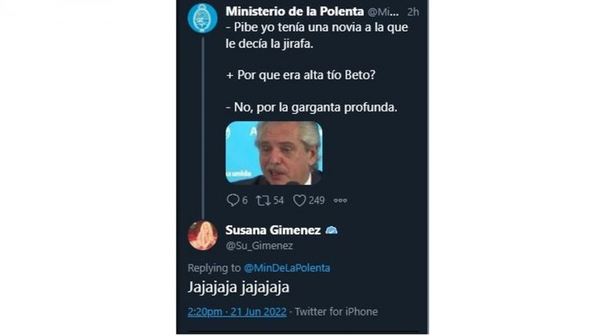 El tuit sobre el que accionó Susana Giménez se trata de un chiste sobre el momento en cuestión. "Pibe, yo tenía una novia a la que le decía jirafa". "¿Porque era alta, tío Beto?". "No, por la garganta profunda", reza la chanza hecha por el usuarios "Ministerio de la Polenta". En respuesta, La Diva de los Teléfonos lanzó un simple y claro: "Jajajajajajajaja".