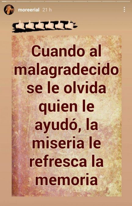 De hecho, Morena Rial voló a Córdoba, para sumarse a la obra teatral “La Mentirita”. Antes de despegar, ella compartió una sugerente frase vía InstaStories: “Cuando al malagradecido se le olvida quién le ayudó, la miseria le refresca la memoria”.
