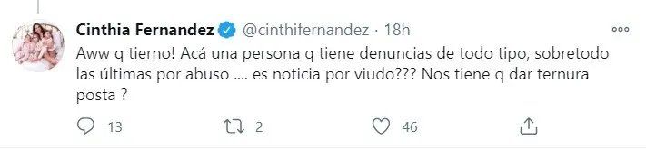 Y agregó: "Aww q tierno! Acá una persona q tiene denuncias de todo tipo, sobretodo las últimas por abuso... es noticia por viudo??? Nos tiene q dar ternura posta?".