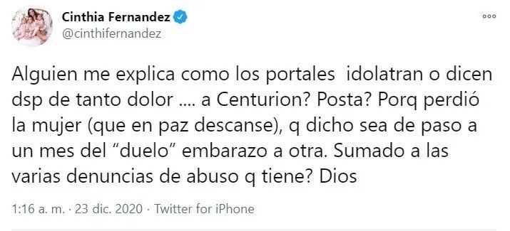 "Alguien me explica como los portales idolatran o dicen dsp de tanto dolor .... a Centurion? Posta? Porq perdió la mujer (que en paz descanse), q dicho sea de paso a un mes del 'duelo' embarazo a otra. Sumado a las varias denuncias de abuso q tiene? Dios", cuestionó Cinthia.
