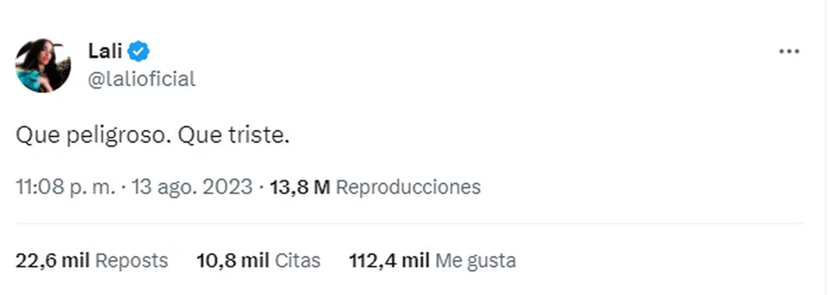 "Que peligroso. Que triste". Minutos antes, aún impactada por las cifras que consiguió el precandidato de La Libertad Avanza, subió a su cuenta de Twitter el popular emoji de los ojos sorprendidos.