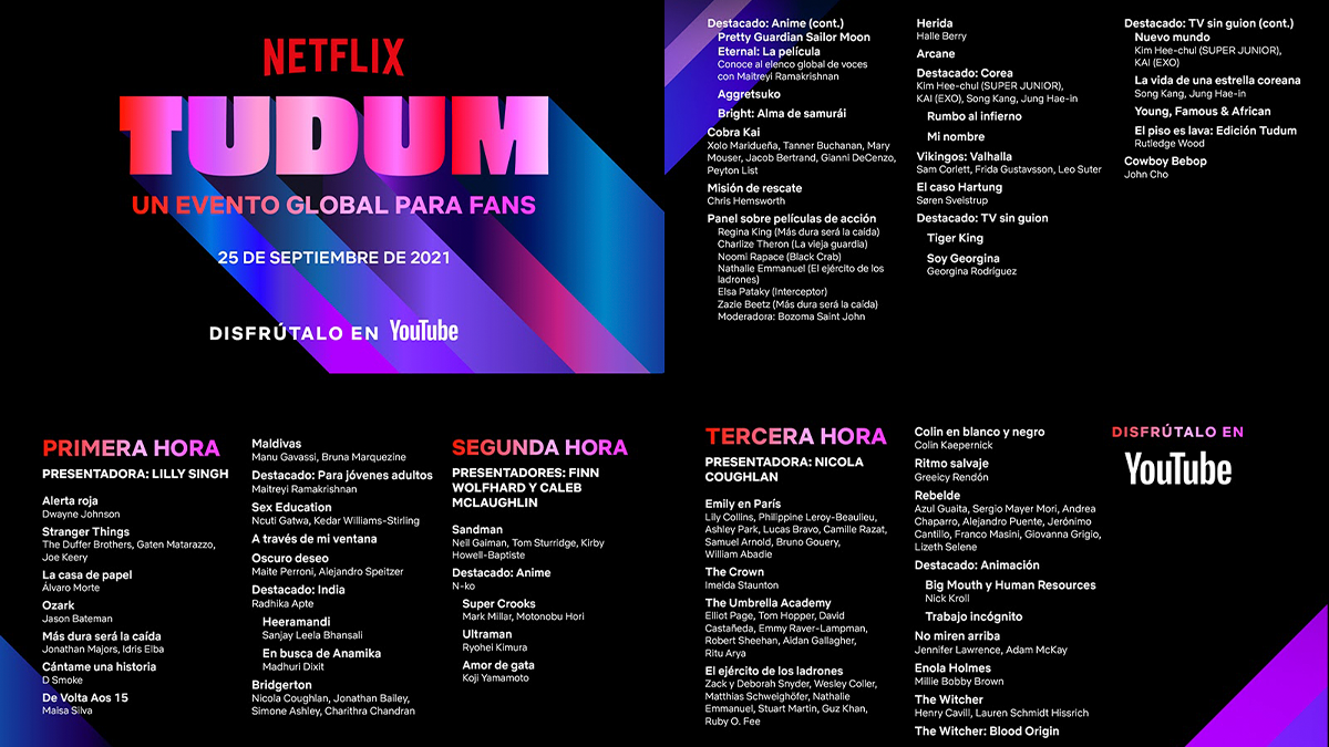 Se presentarán más de 145 estrellas y 100 series y películas en el evento TUDUM, de tres horas, que incluye algunas de las temporadas nuevas más populares, como Stranger Things; Bridgerton; The Witcher; La casa de papel, y Cobra Kai, además de las películas más exitosas, como Alerta roja; No miren arriba; Misión de rescate; Más dura será la caída; La vieja guardia, y más.