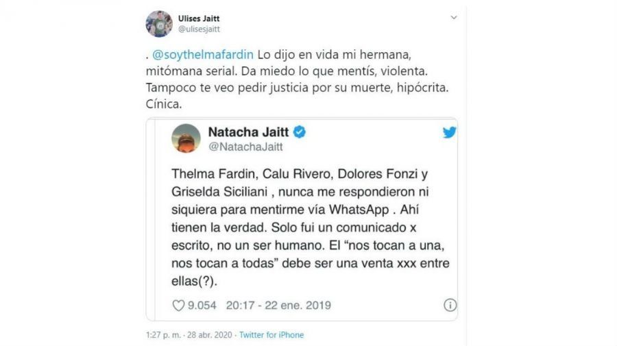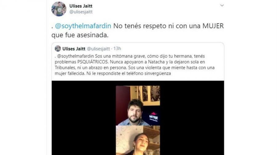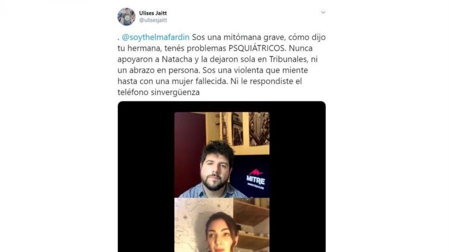 Enterado de las declaraciones de Thelma, Ulises, hermano de Natacha, agarró su cuenta de Twitter y se desquitó: "@soythelmafardin sos una mitómana grave, como dijo tu hermana, tenés problemas psiquiátricos. Nunca apoyaron a Natacha y la dejaron sola en Tribunales, ni un abrazo en persona. Sos una violenta que miente hasta con una mujer fallecida. Ni le respondiste el teléfono sinvergüenza", lanzó el conductor radial entrado en cólera.