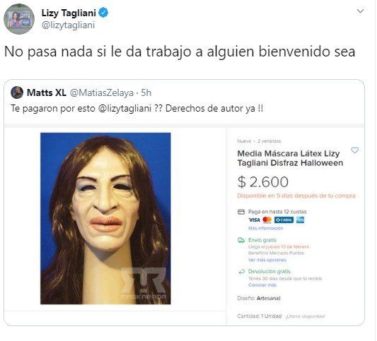 “Te pagaron por esto Lizy? Derecho de autor ya!”, escribió un usuario de Twitter quien compartió una imagen donde se ve la venta de la máscara a través de la plataforma de Mercado Libre.