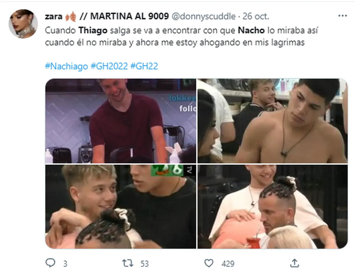 Tanto en Twitter como en TikTok, la novela amorosa entre Thiago y Nacho crece día a día con nuevos acercamientos y anécdotas. Los usuarios que shippean esta relación y se muestran en contra de Martina porque ella dio a entender que le gusta Nacho.