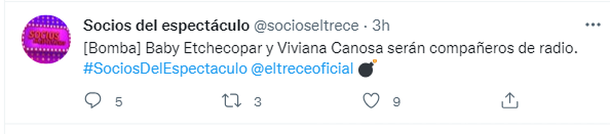 Luego de que pasara mucha agua debajo del puente, se confirmó que Viviana Canosa vuelve a la conducción tras su salida de Grupo América. "Baby Etchecopar y Viviana Canosa serán compañeros de radio", rezaba la información que dieron este mediodía en "Socios del espectáculo". De esta forma, la conductora comenzará próximamente un ciclo propio en Radio Rivadavia, dónde su antiguo compañero en A24 Baby Etchecopar trabaja desde hace un tiempo. Si bien los fans de Viviana querían tenerla de regreso a la tele, tendrán que conformarse con escucharla en la prestigiosa AM.
