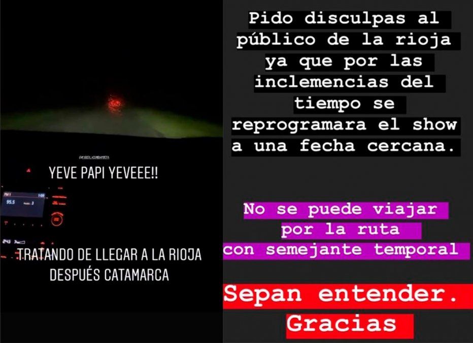 "Pido disculpas al público, ya que por las inclemencias del tiempo se reprogramará el show a una fecha cercana. No se puede viajar en la ruta con semejante temporal", expresó junto a un video que confirma el temporal.