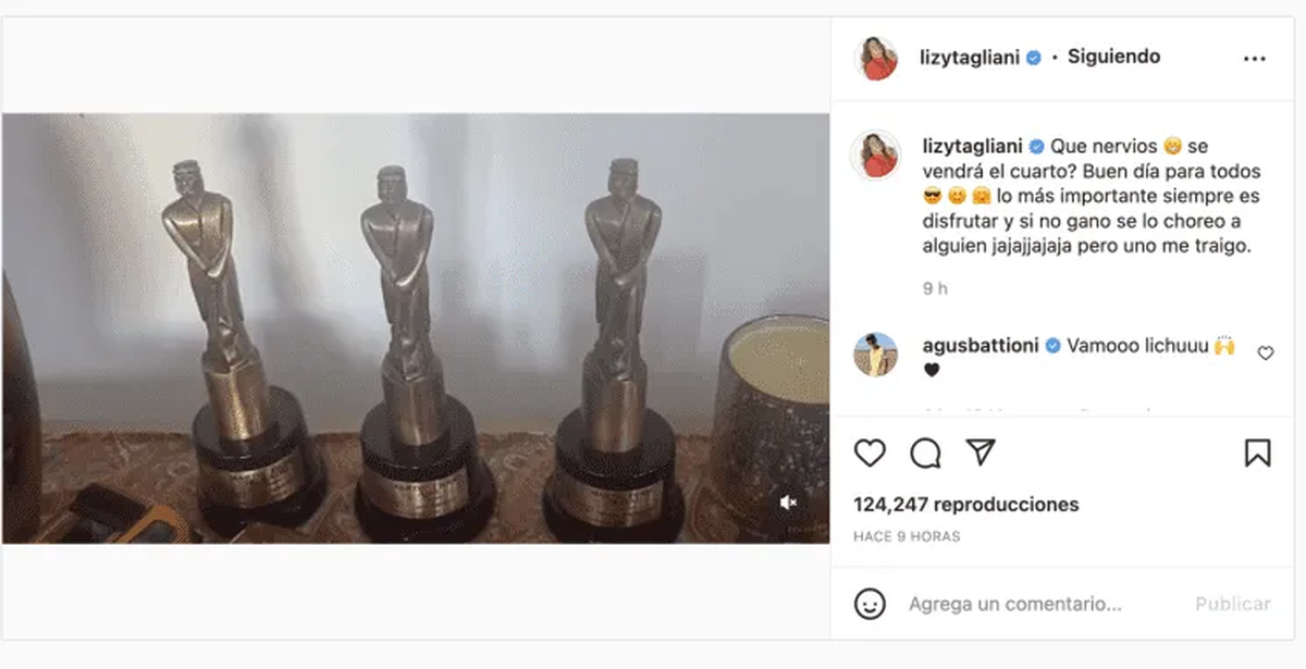 El conductor de LAM se mostró muy feliz de participar de esta ceremonia que lo tiene como nominado como mejor Jurado de televisión y se quejó que había muchas habitaciones ruidosas. Por su parte, Lizy también se mostró muy ansiosa, con el gran sentido del humor que la caracteriza. Con un primer plano de sus premios Martín Fierro, Lizy escribió en su Instagram personal: "Qué nervios. ¿Se vendrá el cuarto? Buen día para todos. Lo más importante siempre es disfrutar y si no gano se lo choreo a alguien, pero uno me traigo".