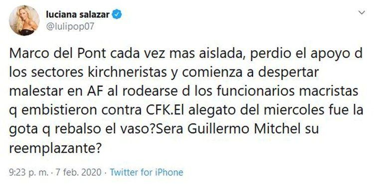 En esta oportunidad, volvieron a cruzarse en la red social, a raíz de los mensajes sobre política que escribe Luli Salazar. Todo empezó por un mensaje que subió la modelo el viernes pasado. “Marcó del Pont cada vez más aislada. Perdió el apoyo de los funcionarios macristas, que embistieron contra CFK. ¿El alegato del miércoles fue la gota que rebalsó el vaso? ¿Será Guillermo Mitchel su reemplazante?”, publicó.