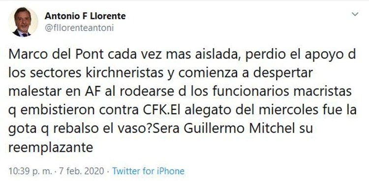 Llorente, por su parte, hizo referencia a lo ocurrido, aunque sin dar mayores explicaciones: “Yo no retwitee el mensaje de Luciana Salazar porque estaba de vacaciones y no utilicé el Twitter. De todas formas es verdad que la cofradía armada por Macri, Carrió y Bonadio continúa intacta, siguen los mismos que armaron las carpetas contra empresarios que consideraban enemigos”