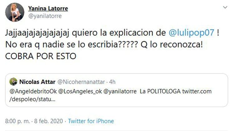 Al notarlo, Yanina Latorre publicó un mensaje, con una fuerte declaración: “¡Quiero la explicación de @lulipop07! ¿No era que nadie se lo escribía? ¡Que lo reconozca! Cobra por esto”.