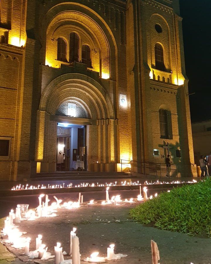 Los alrededores de la iglesia con cientos de velas encendidas.