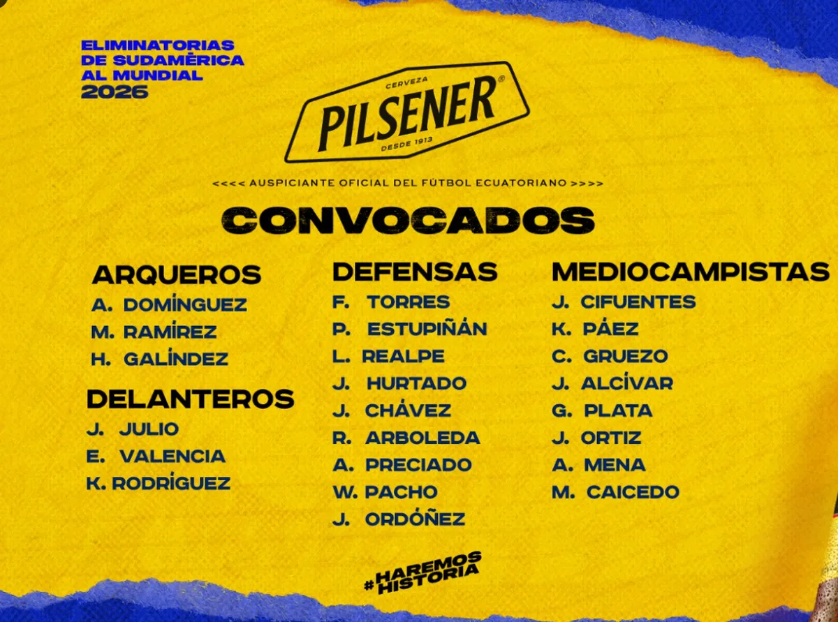 A disposición están Domínguez, Moisés Ramírez y Hernán Galíndez (arqueros); Félix Torres, José Hurtado, Robert Arboleda, Pervis Estupiñán, Jhoanner Chávez y Joel Ordóñez (defensores); José Cifuentes, Carlos Gruezo, Gonzalo Plata, Ángel Mena, Kendry Páez, Jordy Alcívar, Joao Ortiza y Moisés Caicedo (volantes); Jhojan Julio, Enner Valencia y Rodríguez (delanteros).